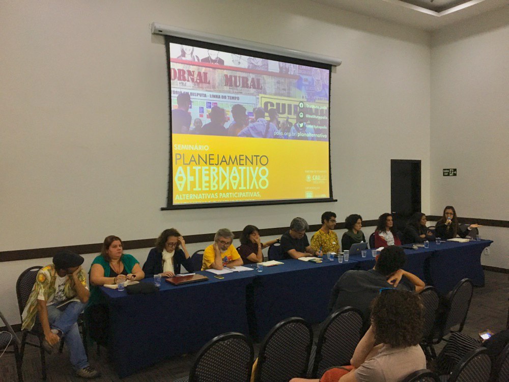 O seminário nacional Planejamento Alternativo: Alternativas Participativas, Inclusivas e Insurgentes foi uma iniciativa do Instituo Pólis com a pareceria de fomento do CAU/SP. O objetivo do evento foi compartilhar, disseminar e aprofundar o debate teórico e prático que possibilitasse a reflexão sobre a atuação de arquitetos e arquitetas urbanistas em novas formas de planejamento territorial. A reflexão proposta partiu das práticas de profissionais, estudantes, técnicos, movimentos sociais e outros atores locais de quatro cidades brasileiras com experiências alternativas de projeto e planejamento de territórios em disputa: Belo Horizonte, Fortaleza, Rio e São Paulo.